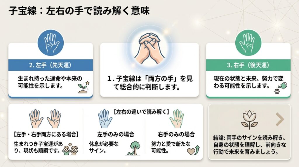 * **左手にあるけど右手にはない**:本来は授かる運命を持っていますが、今は少し疲れが溜まっていたり、ストレスで体が「お休みモード」になっているかもしれません。休息をとってメンタルを整えることで、右手にも線が現れてくるでしょう。