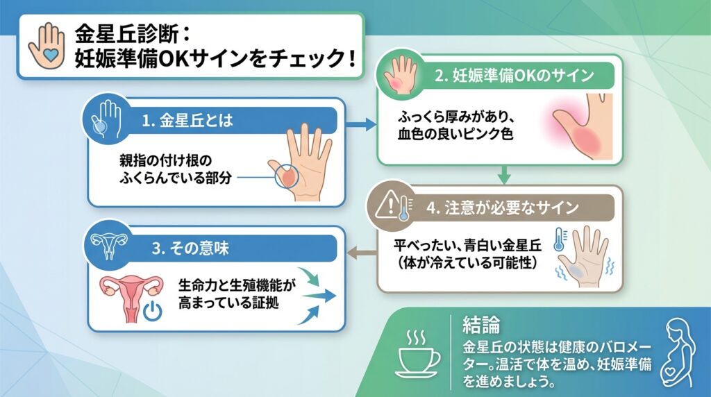 逆にここが平べったかったり、青白い時は体が冷えているかも。温活をして金星丘をふっくらさせましょう。
