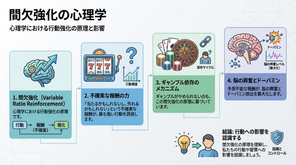 これを心理学では「間欠強化(Variable Ratio Reinforcement)」と呼びます。