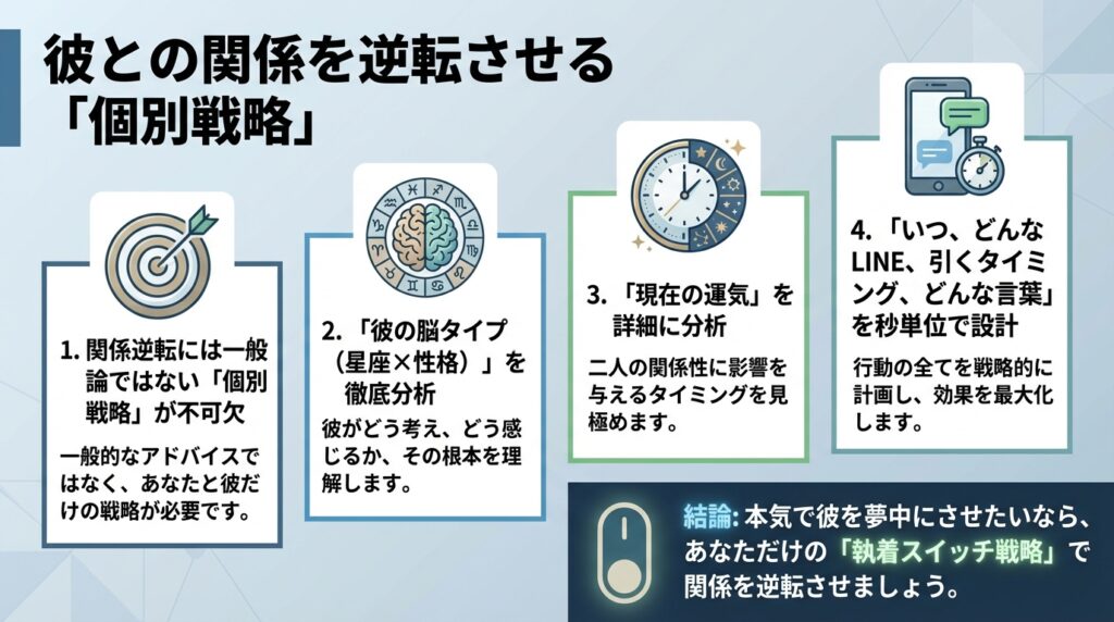 もしあなたが、本気で彼との関係を逆転させたいなら、一般論ではなく「個別の戦略」が必要です。